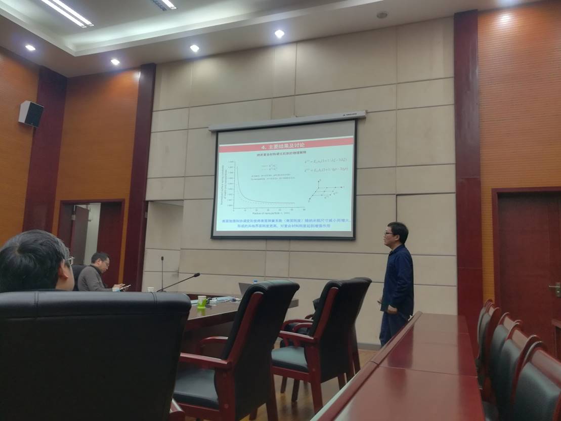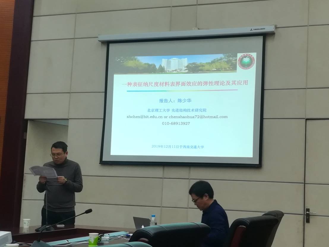 2019年12月11日(周三)下午14:30-16:30,在k1体育十年品牌九里校区1号综合楼4楼报告厅,北京理工大学陈少华教授应邀到公司开展学术交流活动,陈少华教授作了关于“一种表征纳尺度材料表界面效应的弹性理论及其应用”的学术报告,参加学术交流的有包括公司经理康国政教授、副经理李翔宇教授、张旭副教授、于超副教授、苗鸿臣副教授以及研究生在内的三十余人参加,学术交流由公司副经理李翔宇教授主持。