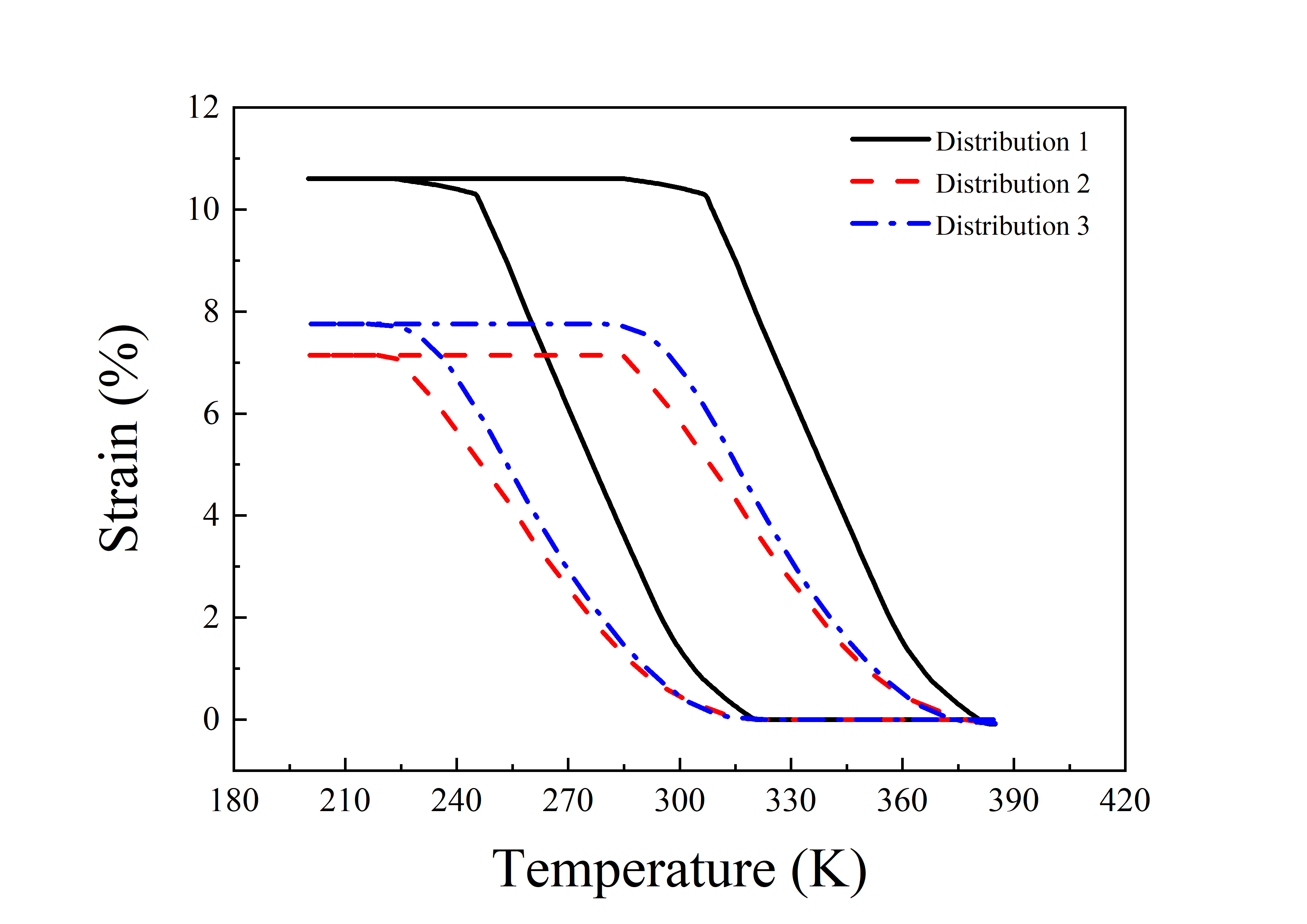 此外,本文通过改变竹状晶微丝内晶粒的大小和晶粒取向,预测内部微结构不同时的双程形状记忆效应和弹卡效应。预测结果表明,竹状晶微丝的宏观性能明显受到微结构的影响。此研究工作拓展了固体本构关系的内涵与外延,可以为材料制备中的微结构调控和性能优化提供相应的理论指导,具有重要的研究价值和应用前景。