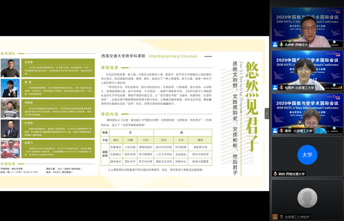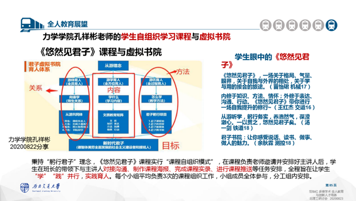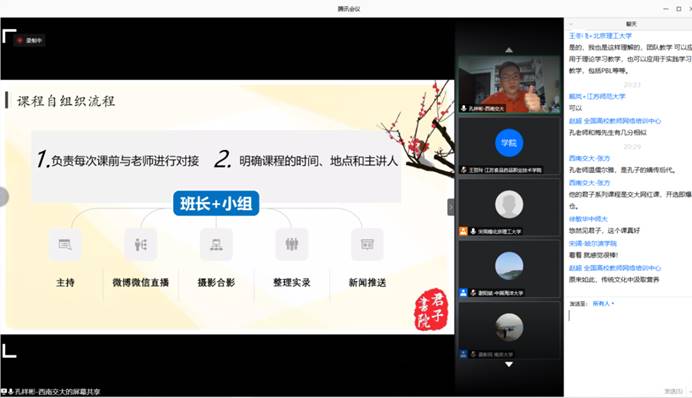 在国家级教学名师、南京大学桑新民教授主持的前置研修坊上,力学公司孔祥彬老师作为特邀嘉宾做了题为“君子虚拟书院的从游育人模式”的报告。君子虚拟书院是力学公司开展通识教育和课程思政的一个积极探索,它以通识课《悠然见君子》、新生研讨课《大学之道》、《大国动力》等课程为载体,将儒家从游育人方法与新时代“三全育人”理念融合,注重从知识、方法、情怀、表达、沟通、行动等“新君子六艺”来培养文质彬彬的新时代君子。与会老师们对这一教育探索表示出浓厚的兴趣,与孔祥彬老师进行了热烈的讨论。
