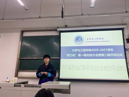 首先由力学公司副经理阚前华总结了努力班的第一期工作,介绍了党员先锋队值班和辅导员巡班的相关情况,高度肯定了砥砺学霸团的带头作用,对疫情期间筹办的努力讲坛给予积极的评价。阚经理提出了对努力班成员们要求与期望,希望同学们秉持“严谨治学、严格要求”的双严传统,相互监督,共同努力。阚经理指出努力班第一期的工作效果显著,告诫同学们贵在坚持,对自己要有信心,要有自我约束,并相信大家都能通过自己的不懈努力,未来早日“脱班”。