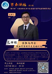 2021年1月27日20:00,力学与工程公司党委副书记、君子(虚拟)书院负责人、公司“青年讲师团”成员孔祥彬老师受邀做客“努力讲坛”第二十五期,讲座主题为“慎独与自省---谈如何写好年度总结计划”。本次讲座由k1体育研究生会承办,是“君子杯”七校航院优秀年度总结计划评选活动第一次辅导讲座,来自k1体育十年品牌、清华大学、浙江大学、北京航空航天大学、南京航空航天大学、电子科技大学、重庆大学等十多所高校400余名师生参加了本次讲座。